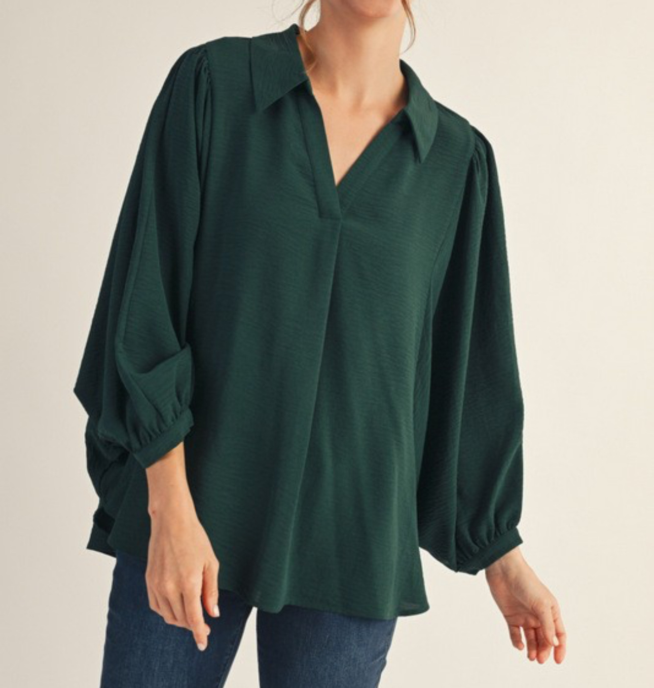 Long batwing sleeves crinkled top with front pleat detail, collared neckline.