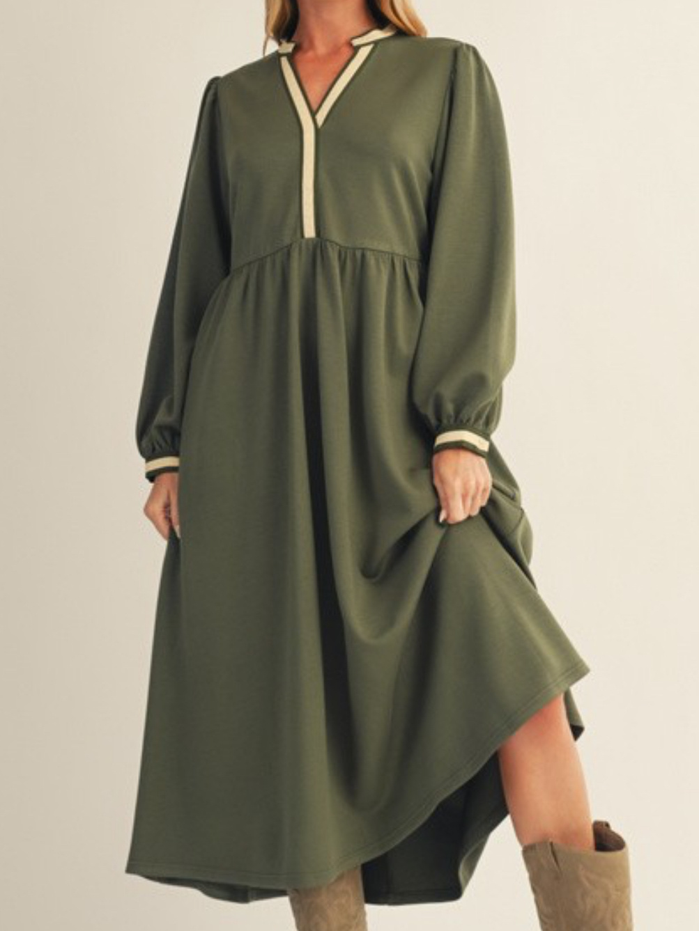 Long puff sleeves solid midi dress with side pockets, solid contrast accent.